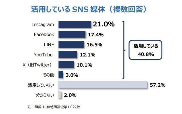 活用しているSNS媒体は、「Instagram(インスタグラム)」が21.0%でトップ。画像や動画など視覚的なコンテンツで、商品や企業イメージなどが伝わりやすい点が理由だと考えられる。次いで、ホームページとして利用できるなどビジネスに特化した機能が豊富な「Facebook(フェィスブック)」(17.4%)、個人の利用率が高い「LINE(ライン)」(16.5%)が続いた。