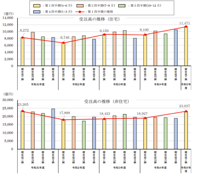住宅の用途・構造別では木造戸建てが5817億円(前年同期比23.2%増)、コンクリート系構造の共同住宅が4412億円(同34.0%増)の順に多い。発注者は個人7777億円(同23.2%増)、管理組合1679億円(同22.9%増)の順となっている。