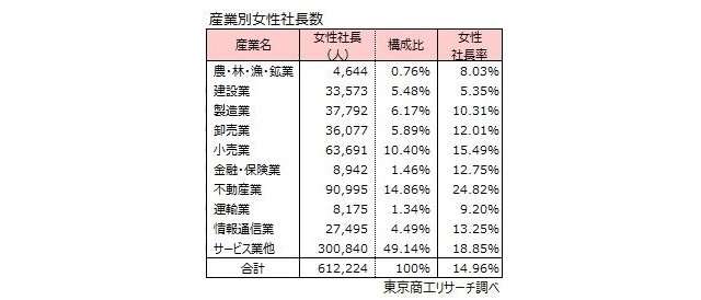 女性社長率は、不動産業の24.82%(前年24.48%)がトップで、10産業のうち7産業で10%を超えた。一方、建設業5.35%(同5.33%)、農・林・漁・鉱業8.03%(同8.06%)など3産業が1桁台にとどまっている。