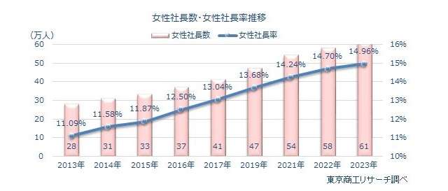 東京商工リサーチ(東京都千代田区)は9月15日、「全国女性社長」調査の結果を発表した。同社が保有する約400万社の経営者情報から、女性社長を抽出、分析したもので今回が12回目。2023年の全国の女性社長は、61万2224人(前年比4.8%増)で初の60万人超えとなった。「女性社長率」(全社長数に対する女性社長数の割合)は、前年比0.26ポイント増の14.96%だった。