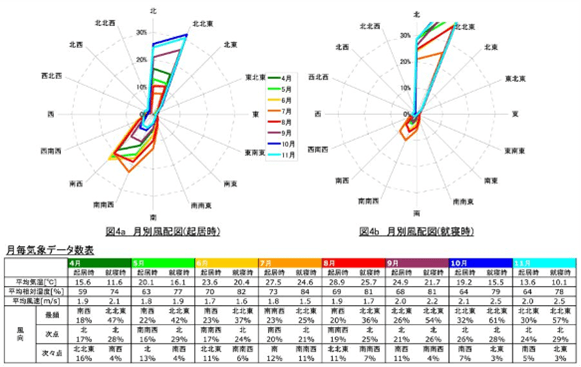 卓越風向のデータはIBECsのホームページからダウンロードすることができ、計画地の卓越風の傾向をつかむ参考になります。ただし、すべての地点を網羅したデータはありませんし、近くに大きな道や川、高層の建物があると風の向きが変わるので、できれば近隣住民の方に季節による風の変化について聞き取りを行うといいでしょう。