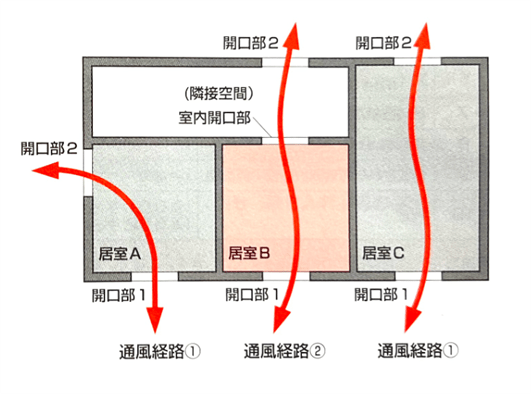 通風経路上の開口部面積を確保します。ここで大事なのは、風の入口と出口を2面以上の壁に配置すること。1面しか確保できない場合は、隣の部屋を経由して通風させます。開口部面積が大きいほど期待できる風量も大きくなります。