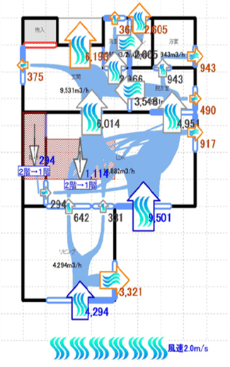 ただ、住まい手には通風シミュレーション[下図]を使って風の流れ方と風量を視覚的に示したほうがわかりやすいと思います。