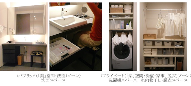 同社は、狭い空間に洗面・洗濯・脱衣の3機能が集中する洗面室の問題点に着目。パブリックゾーン(洗面スペース)とプライベートゾーン(洗濯・家事、脱衣スペース)を分け、室内干し専用スペースや、家族全員が各自のモノを置くスペースを確保することで家事負担の軽減や収納方法のルール化を提案。また、プライベートゾーンに生活感を集中することにより、来客があってもすぐに案内できる洗面スペースを実現している。