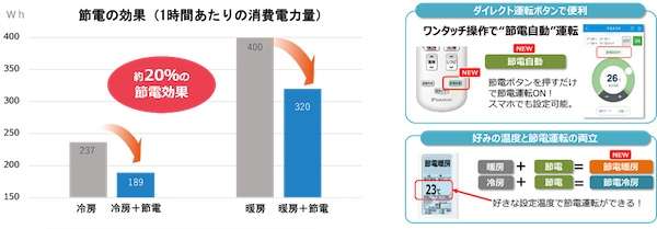 好みの設定温度で節電する場合は、通常の冷房または暖房運転を開始した後に節電自動ボタンを押すことで、好みの温度と節電が両立できるという。