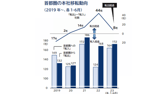 この結果、2023年1~6月における首都圏への本社移転動向は、転出企業が転入企業を8社上回る「転出超過」となった。ただ、転出超過の社数は2022年同期(44社)に比べて大幅に減少している。