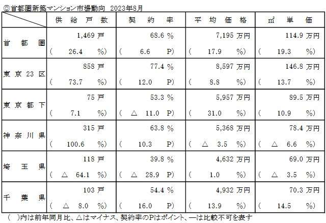 地域別平均価格は、東京23区が8.8%増の8597万円、㎡単価は13.7%増の146.8万円だった。都下は5957万円(31.0%増)・㎡単価89.5万円(10.9%増)、千葉県は4932万円(13.9%増)・㎡単価70.3万円(14.5%増)、埼玉県は4632万円(1.0%増)だった。それ以外の平均価格・㎡単価は、いずれもマイナスとなった。