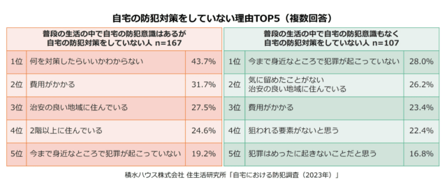 普段の生活のなかで自宅の防犯意識の有無について質問したところ、「意識する/やや意識する」が76%と8割近くに及んだものの、実際に防犯対策をしている人は45.2%と半数以下にとどまっていることがわかった。その主な理由として、「何を対策したらいいかわからない(43.7%)」、「費用がかかる(31.7%)」、「治安の良い地域に住んでいる (27.5%)」、「2階以上に住んでいる(24.6%)」、「今まで身近なところで犯罪が起こっていない(19.2%)」という声が挙がっており、防犯対策の具体的な方法や費用面などでなかなか行動に移せない人が多いことが浮き彫りとなった。