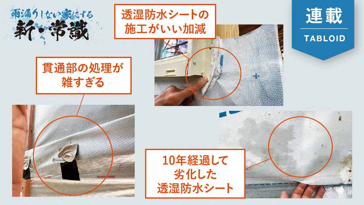 しかし、現実には「この施工者や現場監督は建材の取扱説明書に目を通したことがあるのだろうか」と疑うような、間違った施工をしていたり、明らかに防水に対して認識不足な仕上げをしていたりする。特に防水シートや通気層については、役割や特性、注意点などがあまり知られていないのではないか、という気がしてならない。