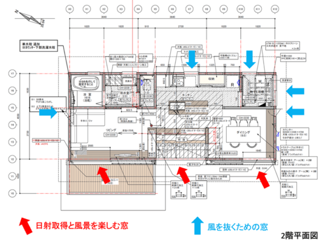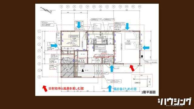 ▽《赤い矢印》は冬場の日射取得と風景、光を楽しむ窓、《青い矢印》は風を抜くための窓。