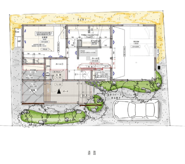 ▽敷地は南西面(ほぼ西向き)に道路があり、道路以外の3方は隣家が近接する36坪の狭小地。