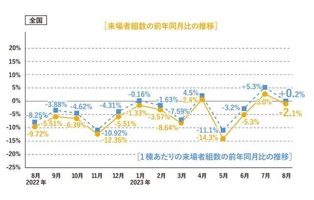 住宅展示場協議会(東京都港区)と住宅生産振興財団(同)が9月15日に発表した8月の住宅展示場の来場者組数は、対前年同月比2.1%減の23万2313組となり、2カ月ぶりに減少へと転じた。