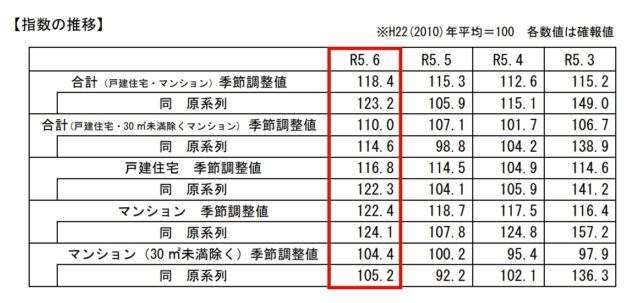 総務省統計局の「住宅・土地統計調査」で把握可能な「既存住宅取引量」には含まれていない別荘、セカンドハウス、投資用物件等を含む。各月の販売量における季節性を排除するため、月次指数において季節調整を行う。