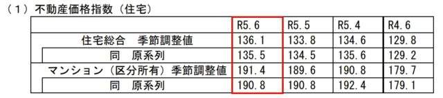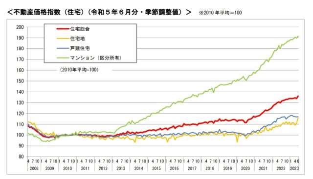 国土交通省は9月29日、2023年6月分の不動産価格指数(季節調整値)を公表した。2010年平均を100として算出したもので、全国の住宅総合は前月比1.7%増の136.1となった。住宅地は同4.0%増の115.6、戸建住宅は同0.1%減の116.9、マンション(区分所有)は同1.0%増の191.4だった。