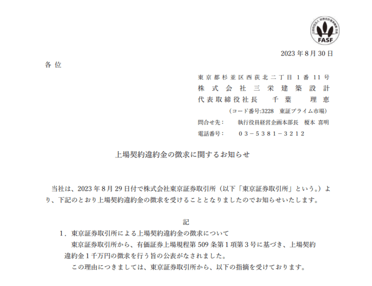 東証が三栄建築設計に違約金1000万請求 虚偽の宣誓書で