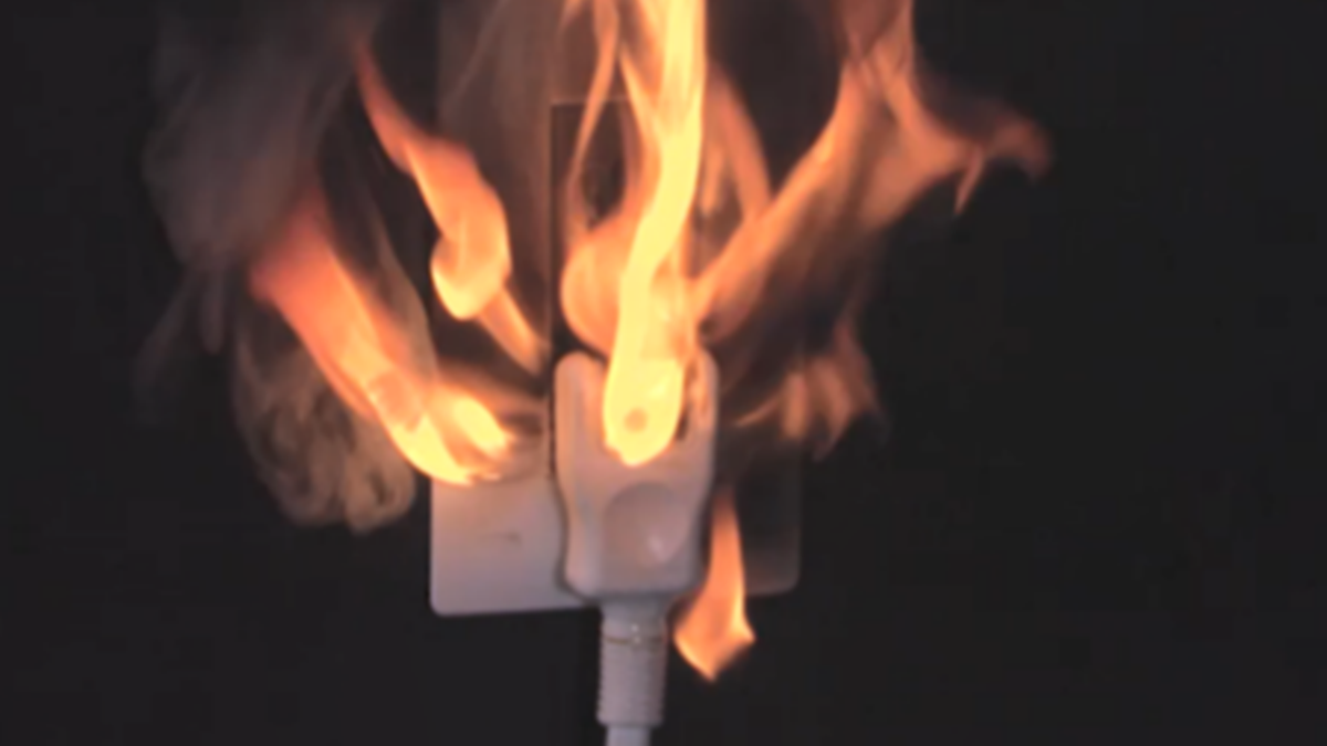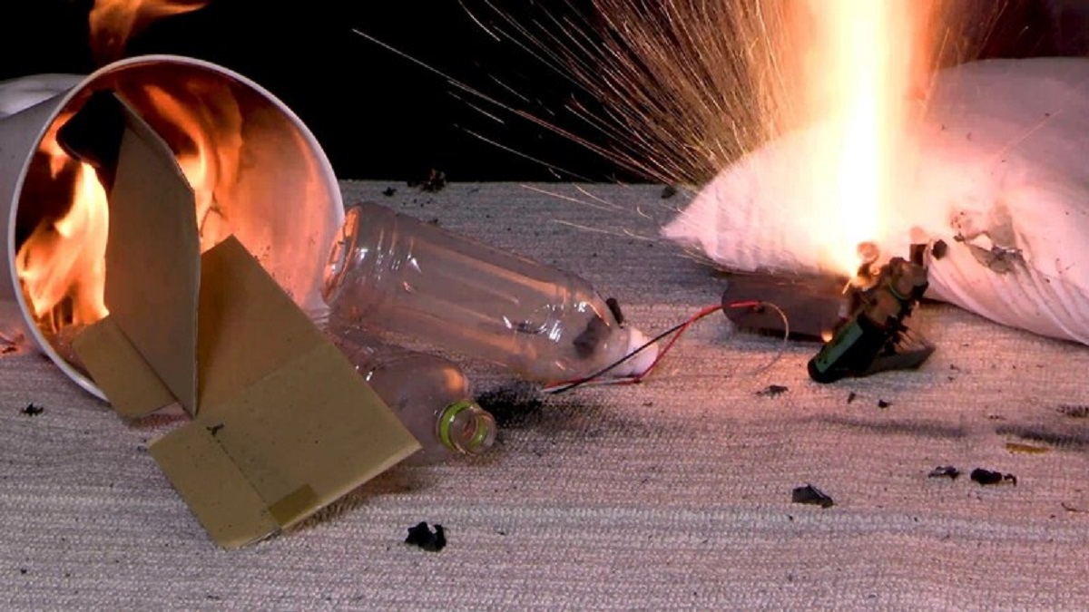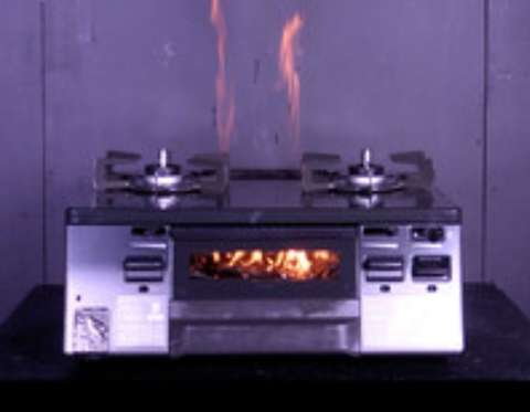 製品評価技術基盤機構(NITE)が行った実験で、出火するガスこんろのグリル(NITE提供)
