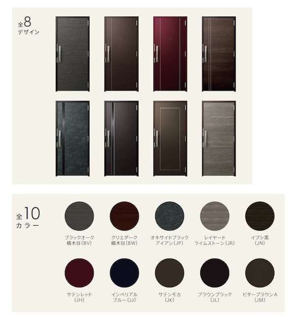8デザイン10色。税別の参考価格39万円(J11型:フラットデザイン、水酸化アルミニウムコア構造プッシュグリップ2ロック ポスト付)。