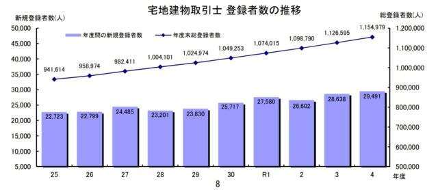 宅地建物取引業者は、対前年度比では、大臣免許が146業者(5.3%)増、知事免許が861業者(0.7%)増で、全体では0.8%増加した。また、宅地建物取引士登録者数は近年増加傾向で、2022年度は新たに2万9491人が都道府県知事に登録。総登録者数は115万4979人となっている。