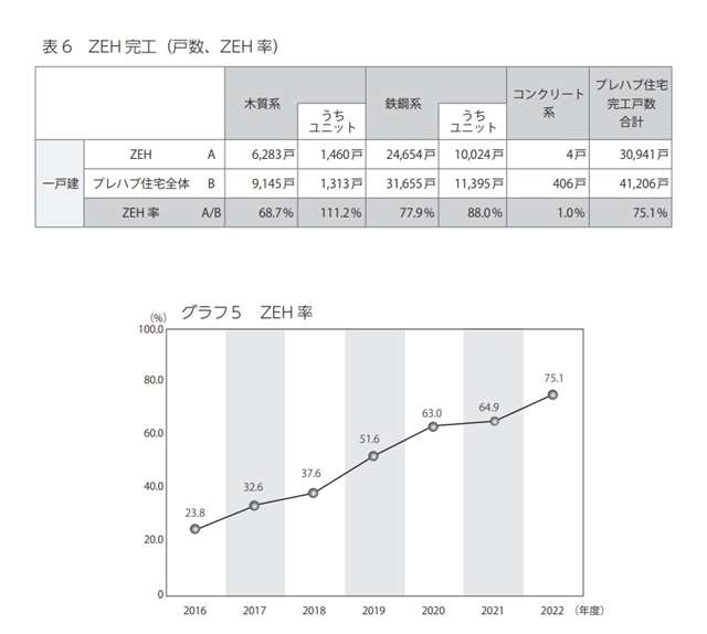 一方、ZEH(戸建)のプレハブ住宅完工戸数は3万941戸で、木質系6283戸、鉄鋼系2万4654戸、コンクリート系4戸。ZEH率(プレハブ住宅完工戸数に占めるZEHの割合)は、木質系68.7%、鉄鋼系77.9%、コンクリート系1.0%だった。全体では75.1%で、前年度より10.2ポイント上昇し、7年連続の増加となった。