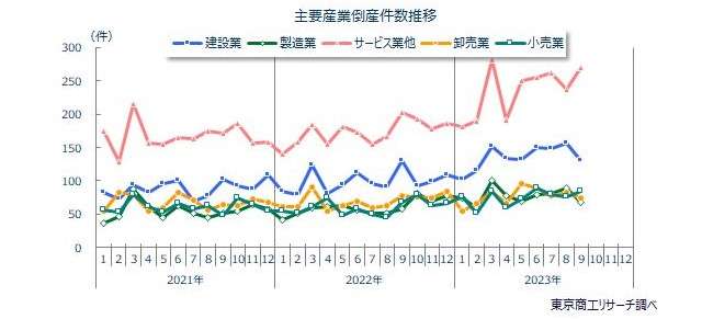 産業別では、10産業のうち7産業が前年同月を上回った。資材価格の高止まりが続く建設業は131件(同0.7%増)で、サービス業他の271件に次ぐ多さ。不動産業は21件(同50.0%増)だった。