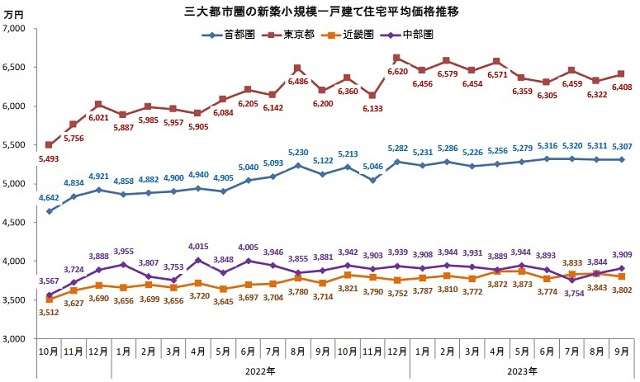 新築小規模一戸建て住宅の平均価格は、首都圏で前月比0.1%減の5307万円と2カ月連続の下落となった。東京都が1.4%増の6408万円と反転上昇したが、首都圏全体では横ばい傾向となっている。神奈川県は4702万円(2.2%減)、埼玉県は4337万円(2.6%減)と下落に転じた。千葉県は4338万円(2.8%増)と反転上昇。価格が上昇した東京都と千葉県は、土地・建物の平均面積がいずれも縮小した。
