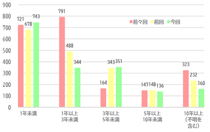 今回の調査では、重大違反が指摘されてからの経過年数が「1年未満」が743件で全体の42.8%を占め、昨年調査時の678件を上回った。「1年以上3年未満」は344件、「3年以上5年未満」は351件、「5年以上10年未満」は136件、10年以上は160件となっている。設備別では、「屋内消火栓設備」が431件、「スプリンクラー設備」が89件、「自動火災報知設備」が1358件だった。