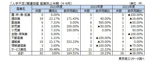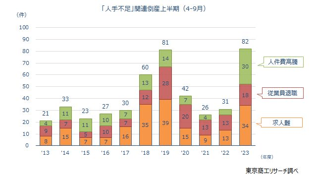 東京商工リサーチ(東京都千代田区)はこのほど、2023年度上半期(4-9月)の「人手不足」関連倒産の状況調査の結果を発表した。