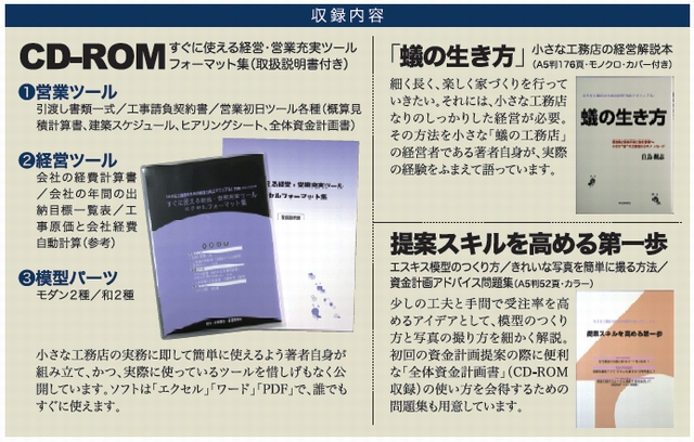 2008年~2010年まで、約2年にわたって新建ハウジングプラスワンに連載された「小さな工務店からのメッセージ~受注難と将来不安に悩むみな様へ」を改題。内容を再編集するとともに、著者が実際に使っている経営・営業ツールをパッケージ化しました。小さな工務店が明日から使える、生きたノウハウが詰まっています。