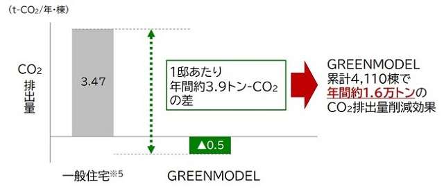 同シリーズの累積引渡し棟数は2023年9月末時点で4110棟となり、3カ年の累積引渡し計画4000棟を達成した。これにより、CO2排出量を一般住宅と比較した場合、年間約1.6万トン-CO2の削減効果が見込まれるという。