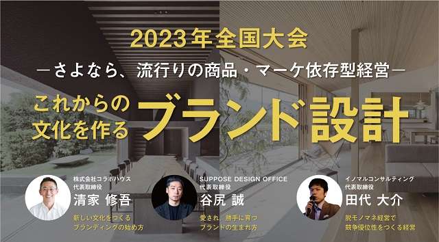 第1部ではコラボハウス(愛媛県松山市)代表取締役・清家修吾さんが「新しい文化を作るブランディング」~設計事務所とつくる家はなぜ伸び続けているのか?~、第2部ではSUPPOSE DESIGN OFFICE(広島市)代表取締役・谷尻誠さんが「愛され、勝手に育つ、ブランドの生まれる理由」~設計者の考え方、ネイチャーデベロップ事業DAICHI、泊まるように暮らすYADO~、第3部ではイノマルケティノ代表取締役・田代大介さんが「競争優位性をつくるブランド戦略」~CIと経営指標マネジメントでエリアNo1ビルダー~と題して講演を行う。10年愛されるブランドコアの作り方、新しい文化になる建築とマーケティング戦略、競争優位性のある商品戦略と組織戦略などを学ぶことができる。