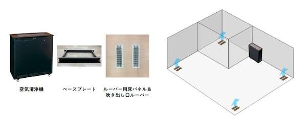 業務用空気清浄機本体で清浄した空気を床下であるOAフロア内部に送風し、OAフロア内をダクトとして利用することで、各室に設けた床吹出口から清浄した空気を室内に吹き上げ、循環させながら効率よく空気清浄するシステム。独自開発の電子式集塵フィルタを搭載しており、ウイルスサイズの粒子を高効率で捕集する。