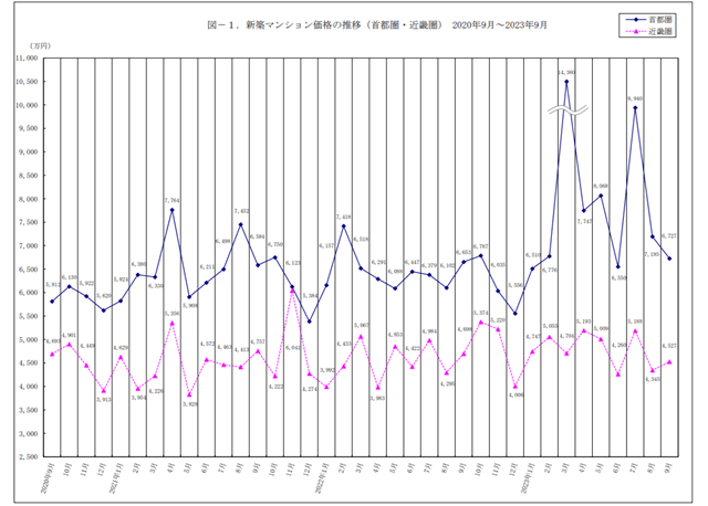 新築マンション価格の推移(首都圏・近畿圏) 2020年9月~2023年9月