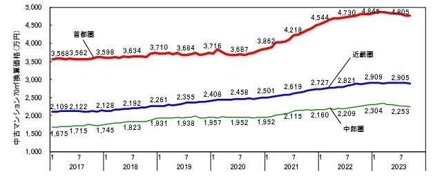 東京カンテイ(東京都品川区)はこのほど、9月の三大都市圏・主要都市における中古マンション70㎡あたりの価格を発表した。