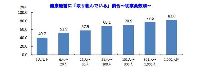 健康経営に「取り組んでいる」企業は56.9%で、半数以上の企業で従業員の健康管理に関する対応策を行っていることがわかった。「取り組んでいない」企業は26.7%だった。「取り組んでいる」企業の割合を従業員数別にみると、「1000人超」は82.6%なのに対し、「5人以下」は40.7%と倍以上の差がみられるなど、従業員数が多いほど割合が高くなる傾向にある。
