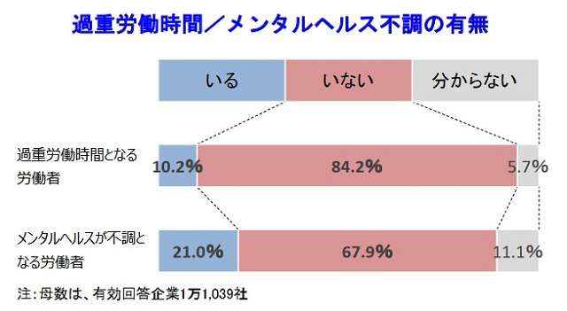 過去1年間で「過重労働時間となる労働者」が「いる」と回答した企業は10.2%、「メンタルヘルスが不調となる労働者」が「いる」企業は21.0%だった。従業員数が多いほど割合が高くなる傾向があり、「1000人超」の企業では過重労働時間が35.5%、メンタルヘルス不調は62.0%に達した。