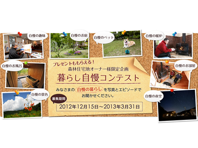 応募資格は、北海道から鹿児島まで14カ所に展開する「森林住宅地」のオーナーであること。イエナカ・イエソト・アソビの3部門に分け、森林住宅地の暮らしぶりを写真とエピソードで自慢してもらう。たとえば、イエナカ部門なら暖炉やアトリエ、イエソト部門なら菜園やバードウォッチング、アソビ部門なら陶芸や釣りというように、自然が豊富な場所ならではの暮らしの楽しさをオーナーの視点で伝えてほしいとする。