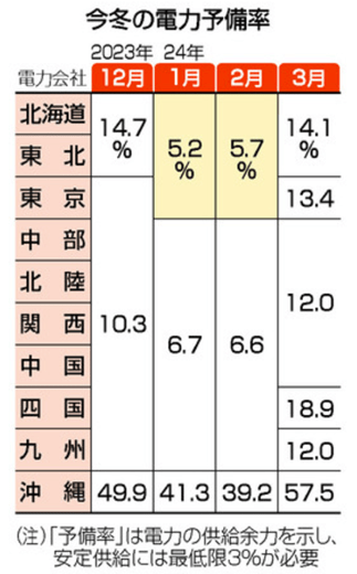 予備率が最も低くなるのは1月の北海道、東北、東京の各電力エリアで5.2%。火力発電所の稼働が増え、供給力が昨年度を上回る。