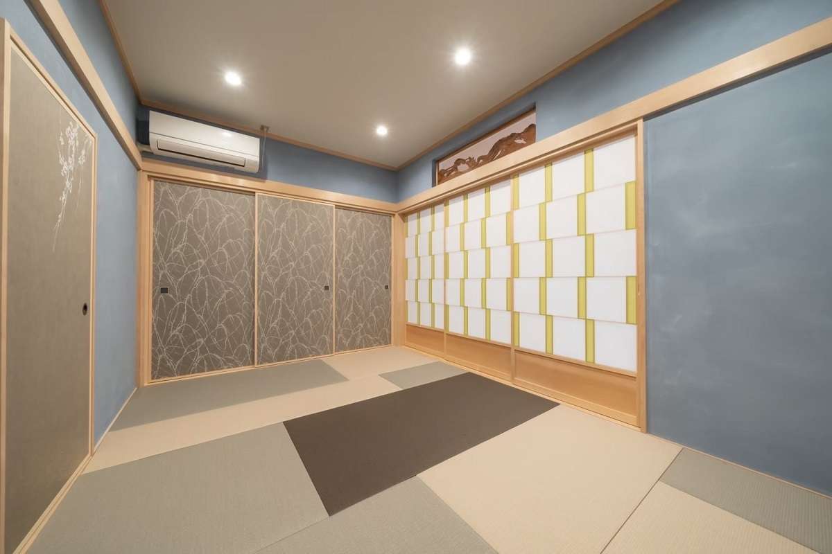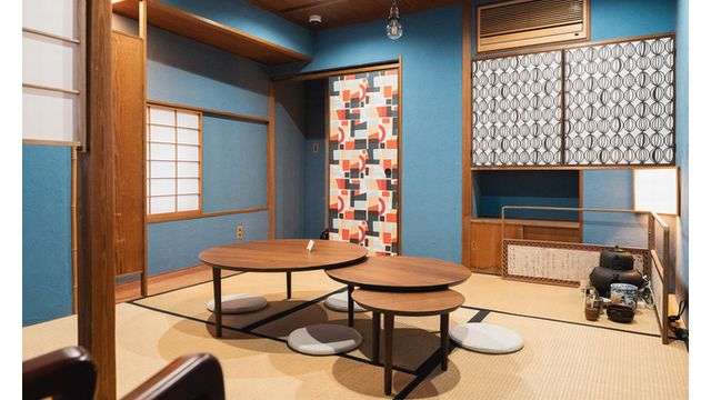 「友安製作所Cafe&Bar 阿倍野」は、モダニズム建築を代表する村野藤吾氏が手がけた歴史的建造物で、同社のデザインプロデュースによりリノベーションした施設。中二階に位置する京間約6畳の和室は、同社商品である柄付きのカラフルな襖紙や室内用塗り壁材を用いたリノベーションを施しており、新旧の時代が重なりあう特別な一室となっている。