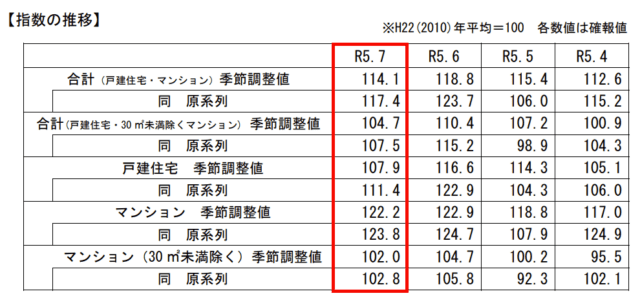 国土交通省は10月31日、登記データをもとに個人が購入した既存住宅の移転登記量を加工・指数化した「既存住宅販売量指数」2023年7月分を公表した。戸建て・マンション合計・季節調整値は前月比3.9%減の114.1、床面積30㎡未満を除いた合計・季節調整値は前月比5.2%減の104.7だった。このうち、戸建住宅の季節調整値は前月比7.5%減の107.9となっている。
