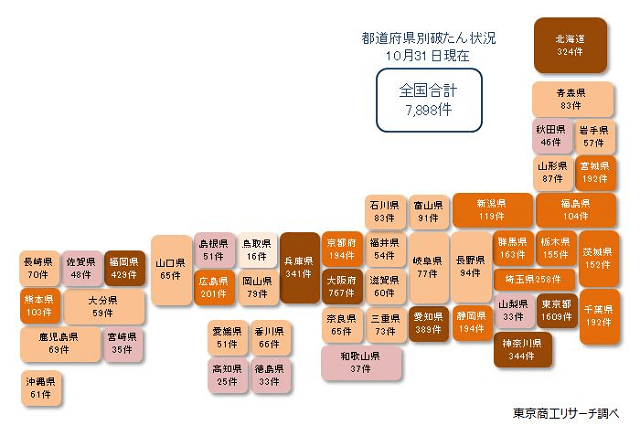 都道府県別では、東京都が1530件と全体の2割強(構成比20.3%)を占め、大阪府735件、福岡県401件、愛知県379件、兵庫県330件、神奈川県322件、北海道311件、埼玉県251件と続く。300件以上が7都道府県、200件~300件未満が1県、100件~200件未満も11府県に広がっている。最少は鳥取県の16件だった。