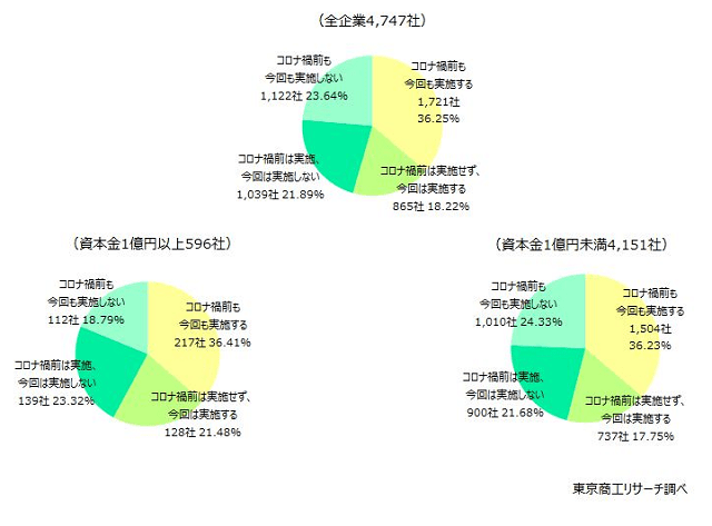2023年末の「忘年会」、または2024年初の「新年会」を開催するか聞いたところ、「コロナ禍前も実施しており、今回も実施する」が36.2%(1721社)と最も多かった。「コロナ禍前は実施していなかったが、今回は実施する」は18.2%(865社)で、今シーズンに忘・新年会を実施する企業は、合わせて54.4%だった。一方、「コロナ禍前は実施しておらず、今回も実施しない」は23.6%(1122社)、「コロナ禍前は実施していたが、今回は実施しない」は21.8%(1039社)で、忘・新年会を実施しない企業は合わせて45.5%だった。「実施する」企業を規模別でみると、大企業は57.8%(596社中、345社)、中小企業は53.9%(4151社中、2241社)となった。