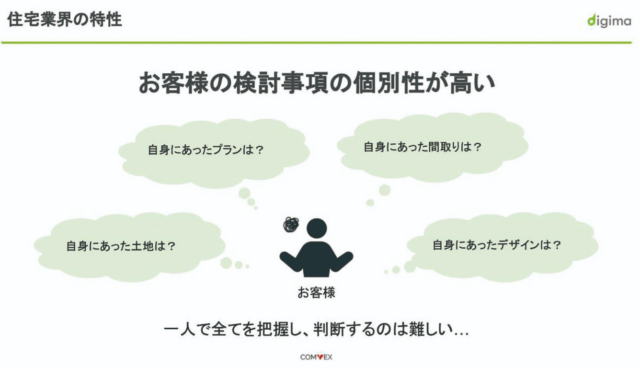 一方で「資料請求を行った見込み客、全員を適切にフォローできているわけではない」(相馬さん)現状もある。生活者の購買行動では「とりあえず資料請求」のパターンもあり、検討状況が把握できないまま全ての問い合わせに対応することは現実的ではないからだ。また、同社の営業は設計も兼務しているため、1つずつ図面を書いて提案していたらきりがない。