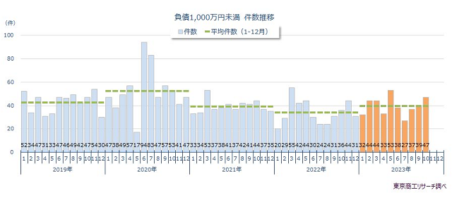 東京商工リサーチ(東京都千代田区)は11月9日、10月の「負債1000万円未満」倒産状況について発表した。負債1000万円未満の企業倒産は、前年同月比30.5%増の47件で、5月から6カ月連続で前年同月超えとなった。10月に前年同月を上回ったのは3年ぶりで、2009年以降では2010年(52件)に次いで3番目の多さとなった。「新型コロナ」関連倒産は、13件(前年同月9件)だった。
