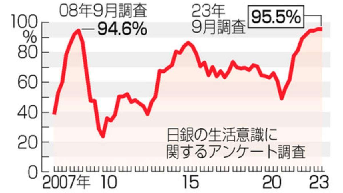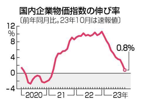 日銀が13日発表した10月の国内企業物価指数(速報値、2020年平均=100)は119.1となり、前年同月比0.8%上昇した。上昇は32カ月連続だが、原材料価格の高騰などを受けた価格転嫁が一服し、プラス幅は10カ月連続で縮小。2021年2月(前年同月比0.9%下落)以来、2年8カ月ぶりに1%を割り込んだ。