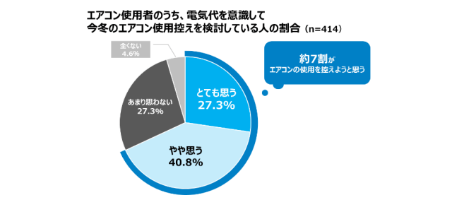 エアコンを使っている人を対象に『今年の冬は電気代を意識して、エアコンの使用を控えようと思うか』聞いたところ、約7割が「とても思う(27.3%)」「やや思う(40.8%)」と回答。