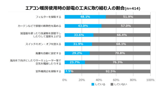 『冬にエアコンを使う際に気を付けていること』としては、「フィルターを掃除する」が48.1%、「カーテンなどで部屋の断熱性を高める」が43.0%、「加湿器を使ったり、洗濯物を部屋干ししたりして湿度を上げる」が33.6%、「スイッチのオン・オフを控える」が31.9%となった。最も実施率が低い「室外機周辺を掃除する」は1割未満で、実施率が最も高い「フィルターを掃除する」でも半数を下回るなど、節電への取り組みの実施率は低い結果となった。