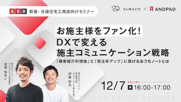 同社では12月7日16:00から、工務店向けのオンラインセミナー「お施主様をファン化!DXで変える施主コミュニケーション戦略」を開催する。詳細はこちらから。