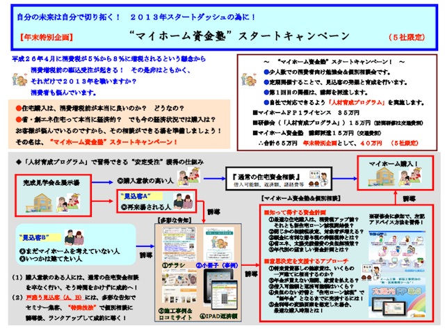 消費税増税にともなう購入者の負担軽減策や、省エネ・創エネ住宅の経済性などをテーマにしたお金にまつわる住まい手向けセミナー・勉強会、個別相談会を開催するために必要な専用営業ツールを提供する。工務店スタッフがセミナー講師をつとめられるよう育成、講師の派遣も行う。