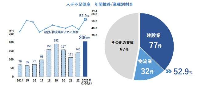 帝国データバンク(東京都港区)は11月14日、1-10月の「人手不足倒産の動向調査」の結果を発表した。10月の人手不足倒産は29件で、年間累計は206件に達した。人手不足割合はコロナ禍前と同等のレベルまで上昇し、高止まりが続いている。10月時点で年間ベースの過去最多を更新し、2014年以降初めて200件を上回る高水準となった。