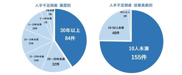 業歴別では、約4割にあたる84件が「30年以上」だった。従業員数別では「10人未満」の小規模事業者が約75%と大半を占めており、1人の退職ダメージが大きいことが原因と考えられる。